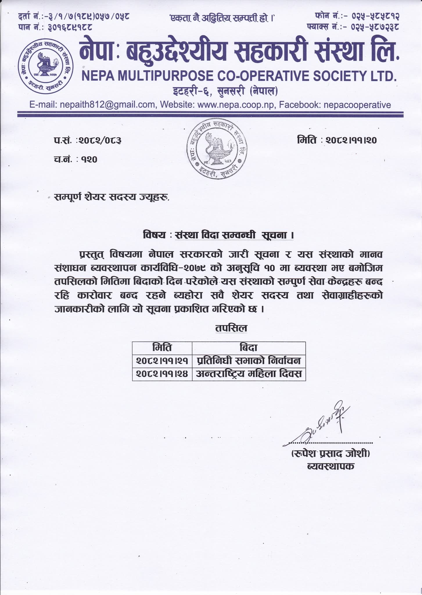 Nepa Cooperative is a model cooperative of the country. It is an example in the field of successful cooperatives to win the award of the best cooperative in the country