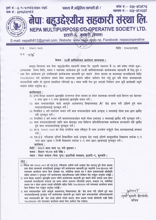 सदा झै यस् बर्ष पनि यस् संस्था बिधिवत दर्ता भएको दिनको उपलक्ष्यमा निम्न...